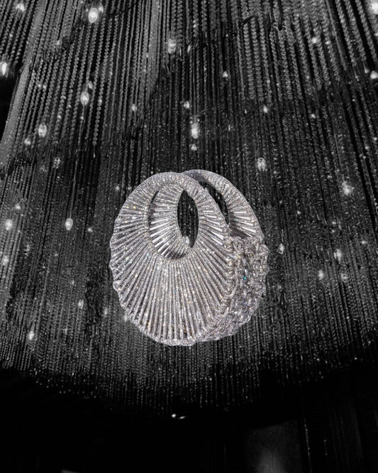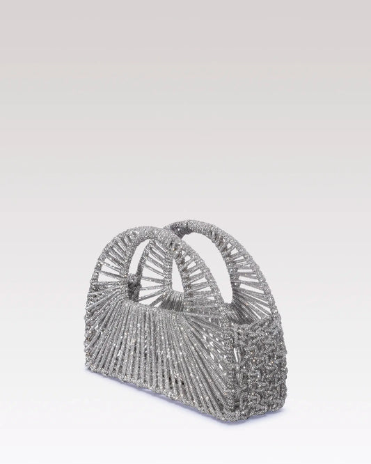 Meet the newest showstopper in evening accessories. The Sara Jewel Mini Bag is an art piece sculpted entirely from hand-strung rhinestone crystal cords, giving it a luminous, liquid-shine effect from every angle.